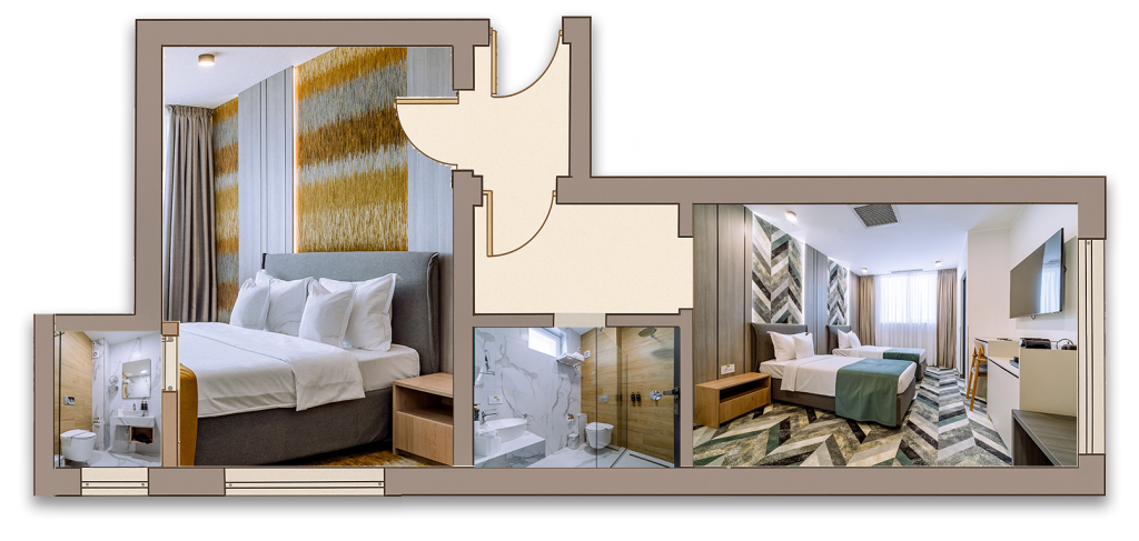 Situat în corpul principal al hotelului, Apartamentul Standard este gândit pentru familii sau grupuri de până la 4 persoane, oferind două dormitoare separate – unul cu pat matrimonial și unul cu paturi twin.